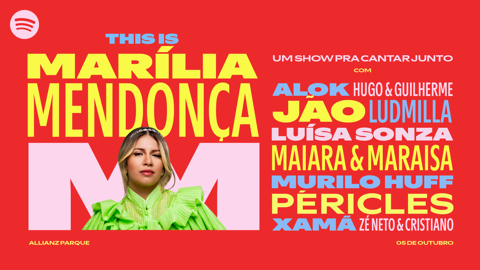 Os fãs da cantora já podem começar o esquenta com o hub Marília Mendonça com uma coleção de playlists especiais. A seção Um Show Para Cantar Junto: Line-Up, que entra hoje no ar, reúne as playlists This Is de todos os artistas do lineup desse grande show. E tem mais: This Is Marília Mendonça 05/10 em SP contém as playlists This Is Marília Mendonça com seus maiores hits, Written by Marília Mendonça com suas composições, além de sua discografia; Temas da Rainha tem playlists temáticas com canções do catálogo da cantora; e Marília em Podcasts traz episódios especiais e entrevistas relacionadas à artista. Nas semanas que antecedem este evento monumental, o Spotify continua celebrando o legado de Marília por todo o Brasil, das ruas às experiências digitais.