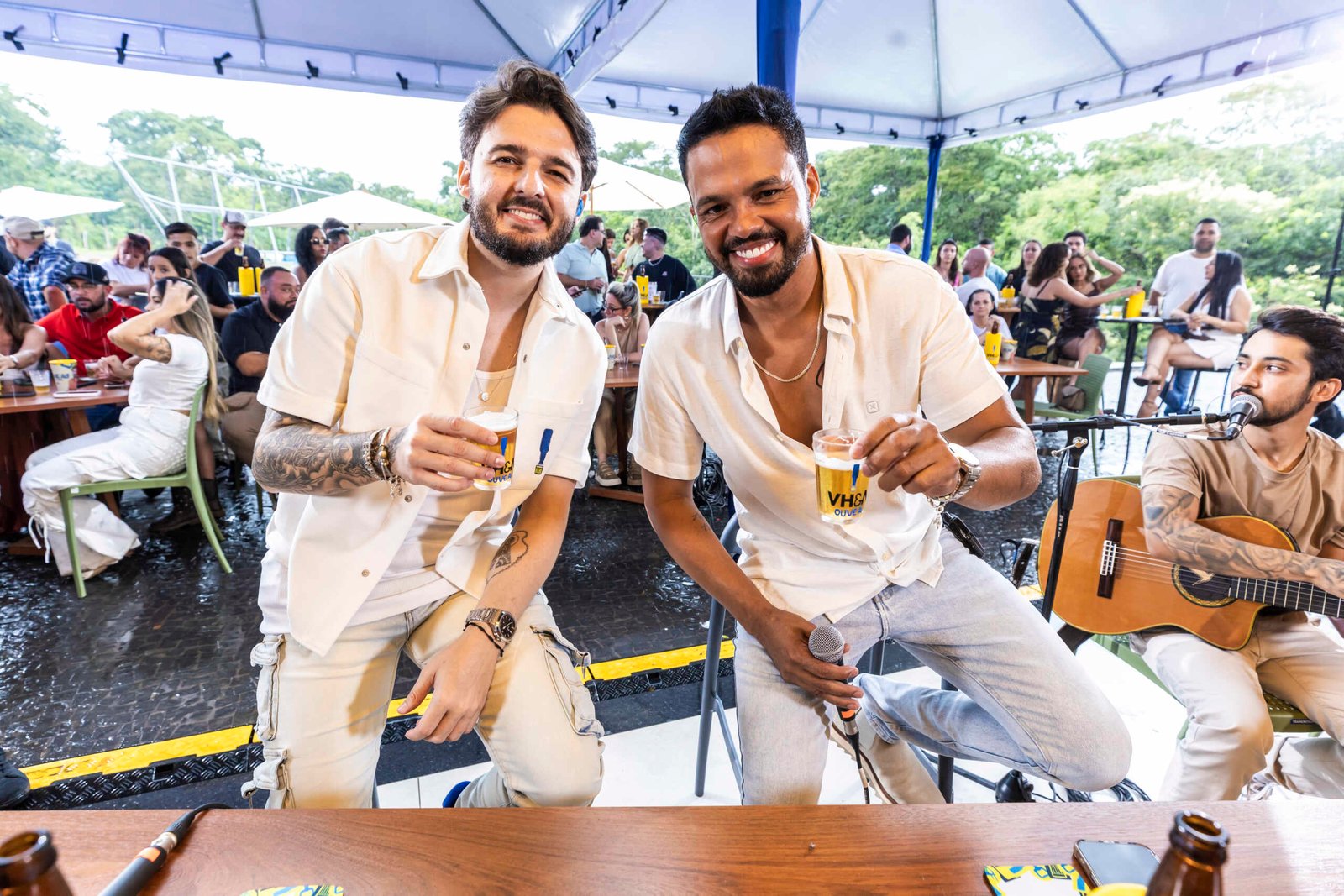 A dupla VH e Alexandre apresenta, nesta quinta-feira (26), às 21h, o EP 1 do projeto “Ouve Aí”, que traz faixas inéditas e com participações especiais de Hugo & Guilherme e Rafa & Júnior, reforçando o novo momento da dupla no sertanejo. Gravado no mês passado em Goiânia, na Chácara Estância BBQVINNY, o trabalho aposta em um repertório que equilibra inéditas e releituras, com proposta intimista e temática de bar e foco na conexão com o público.